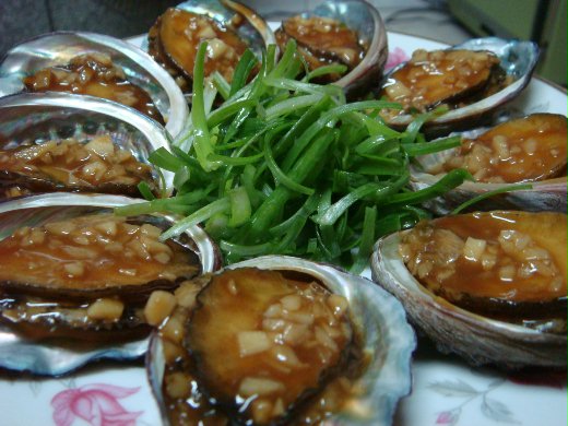 以新鮮鮑魚川燙取出內臟.再以蠔油燒至入味