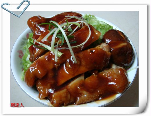 調些玉米粉水收乾湯汁.萵苣鋪在飯上放上雞腿肉與香菇