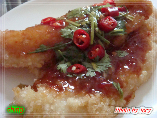 香菜辣椒與泰式酸辣醬調和淋在魚肉即可!
