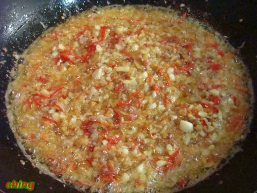 先炒香紅蔥頭後在下蒜頭續炒香至微黃