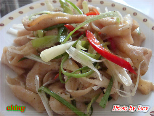 蔥辣椒切絲與鵝腸鹽香油拌勻冰涼更好吃
