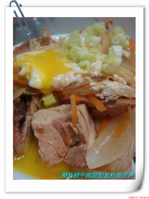 材料:洋蔥.胡蘿蔔絲.芹菜株.雞腿肉.蛋