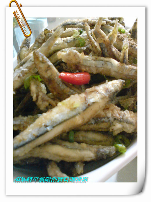 將辣椒片.蔥花,胡椒鹽灑上丁香魚即完成!