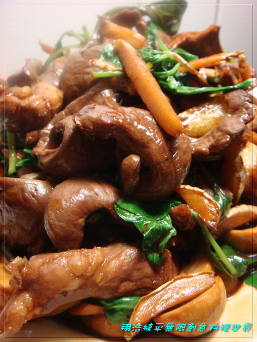 下麻油將薑蒜仁爆香.下豬心快速拌炒