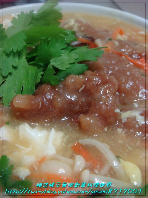 煮滾下金針菇.葫蘿蔔絲.打下蛋花最後下肉條