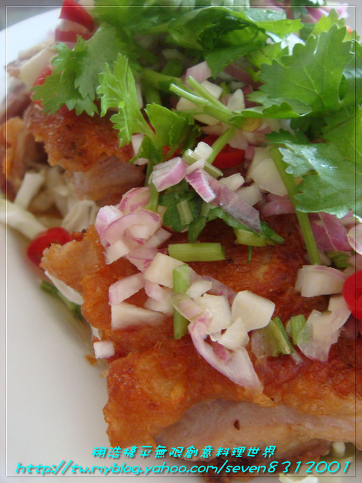 淋上A與B醬汁,上面在灑點香菜葉即完成!