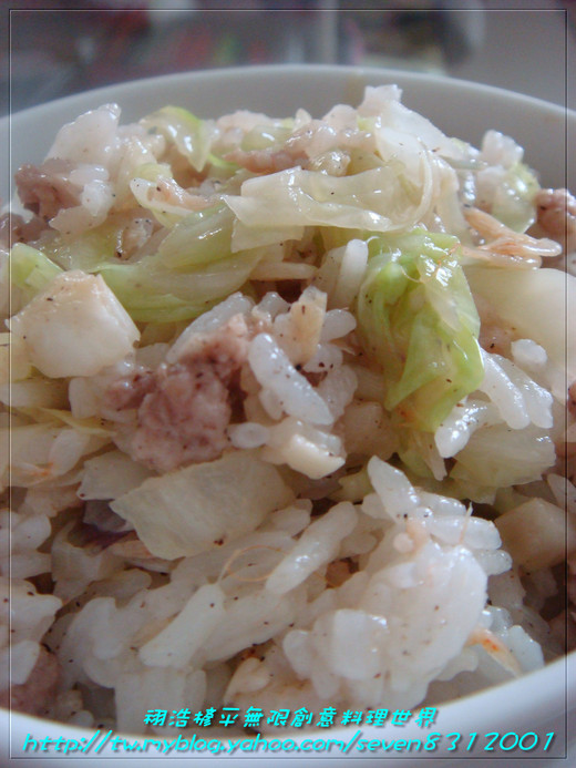 材料:泰國香米.高麗菜.蝦皮(蝦米).肉末.紅蔥頭.蒜末