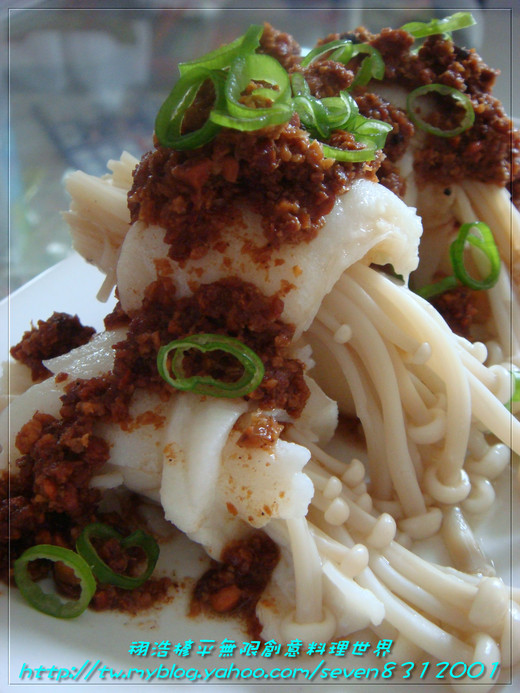 蒸熟圓鱈捲淋上豆酥醬.灑少許蔥花即可!