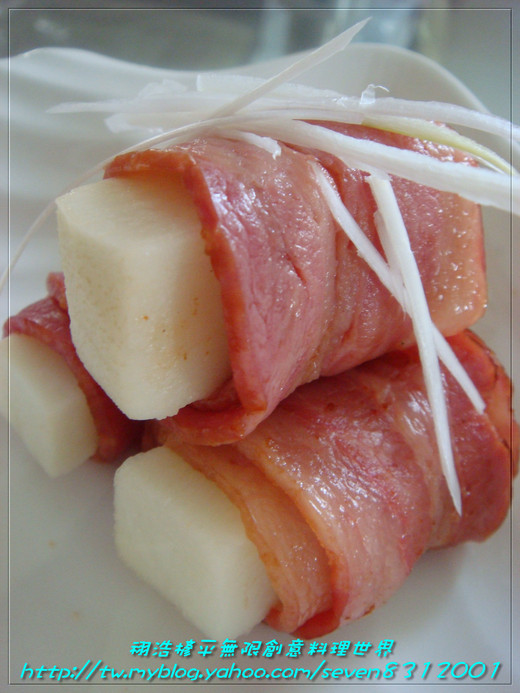 培根捲上竹筍定型即可.加些蔥私貨香菜絲偕可!