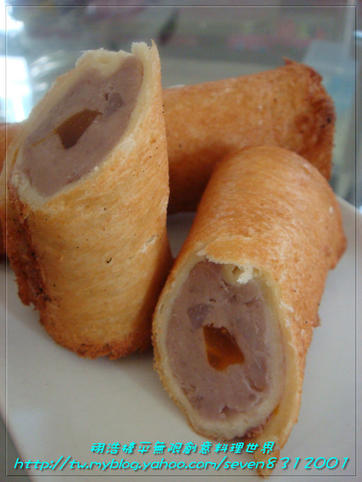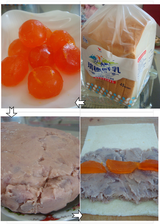 冷卻芋泥抹在土司上加入鹹蛋黃捲成圓筒狀