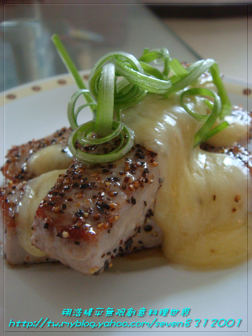 材料:黑鮪魚紅肉塊.蔥綠苗.起司