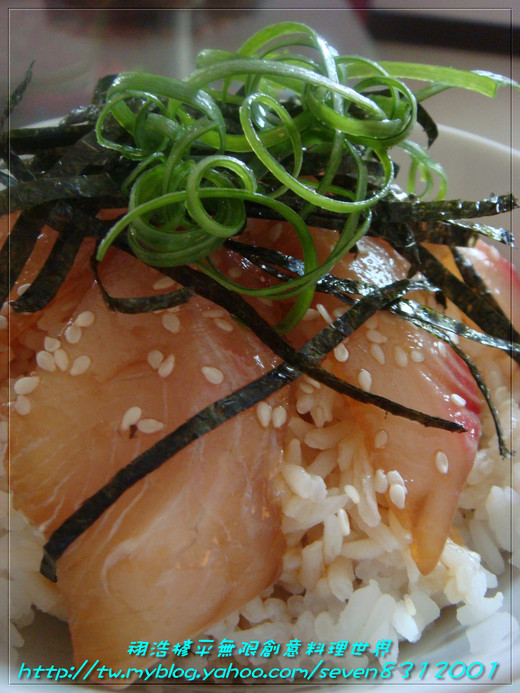 再灑上海苔絲蔥絲即完成一碗好吃生魚片丼