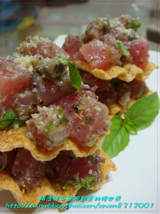 材料:黑鮪魚刺身.酸豆.九層塔.榖麥脆片