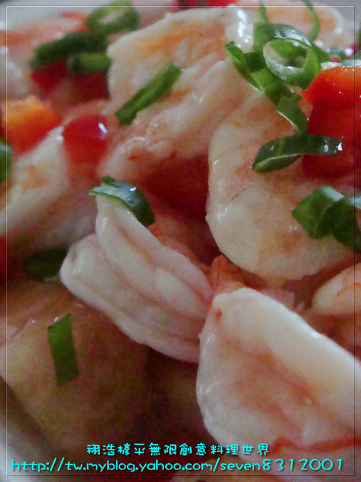 材料:橎桃(水蜜桃).白蝦.紅椒.蔥末