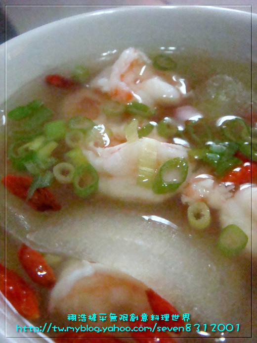 干貝湯煮滾放入蝦仁煮熟下枸杞子