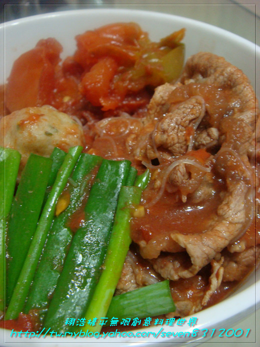 材料:安格斯牛肉片.牛蕃茄.蔥.蒜末.丸子