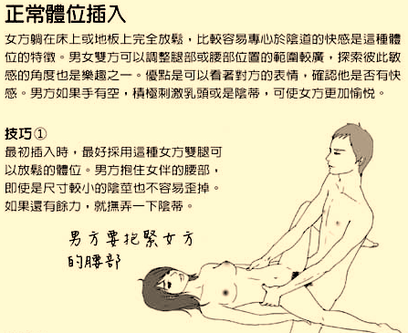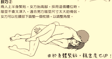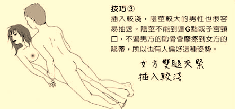 如果男生的私密處尺寸較大,可以利用技巧(3)的方法,不深入但仍能刺激到女生的私密處而不會過於疼痛: