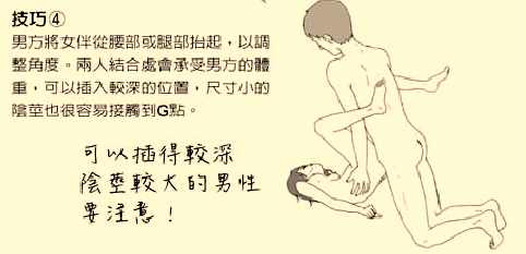 如果男生的私密處尺寸比較小,可以多利用技巧(4)的方法,把身體的重量壓在身體交合處,可以更容易接觸到女生的神祕G點: