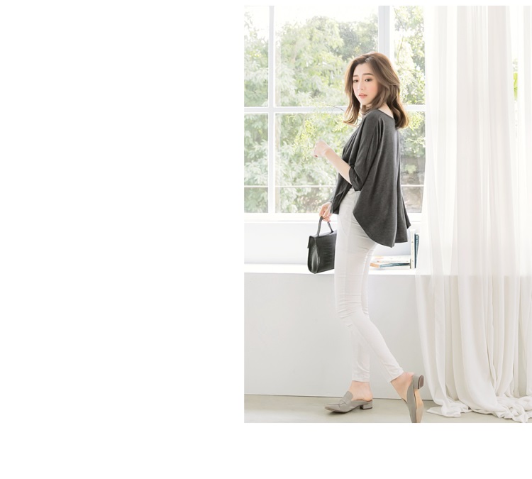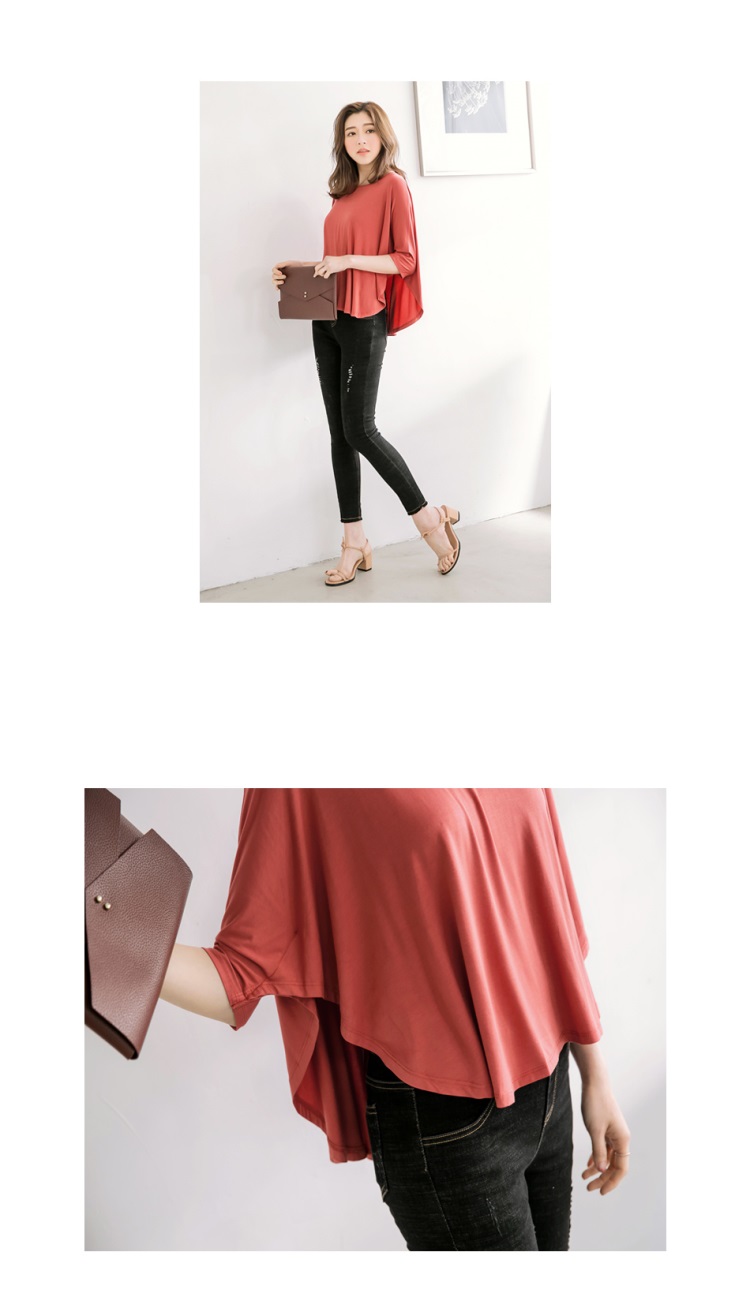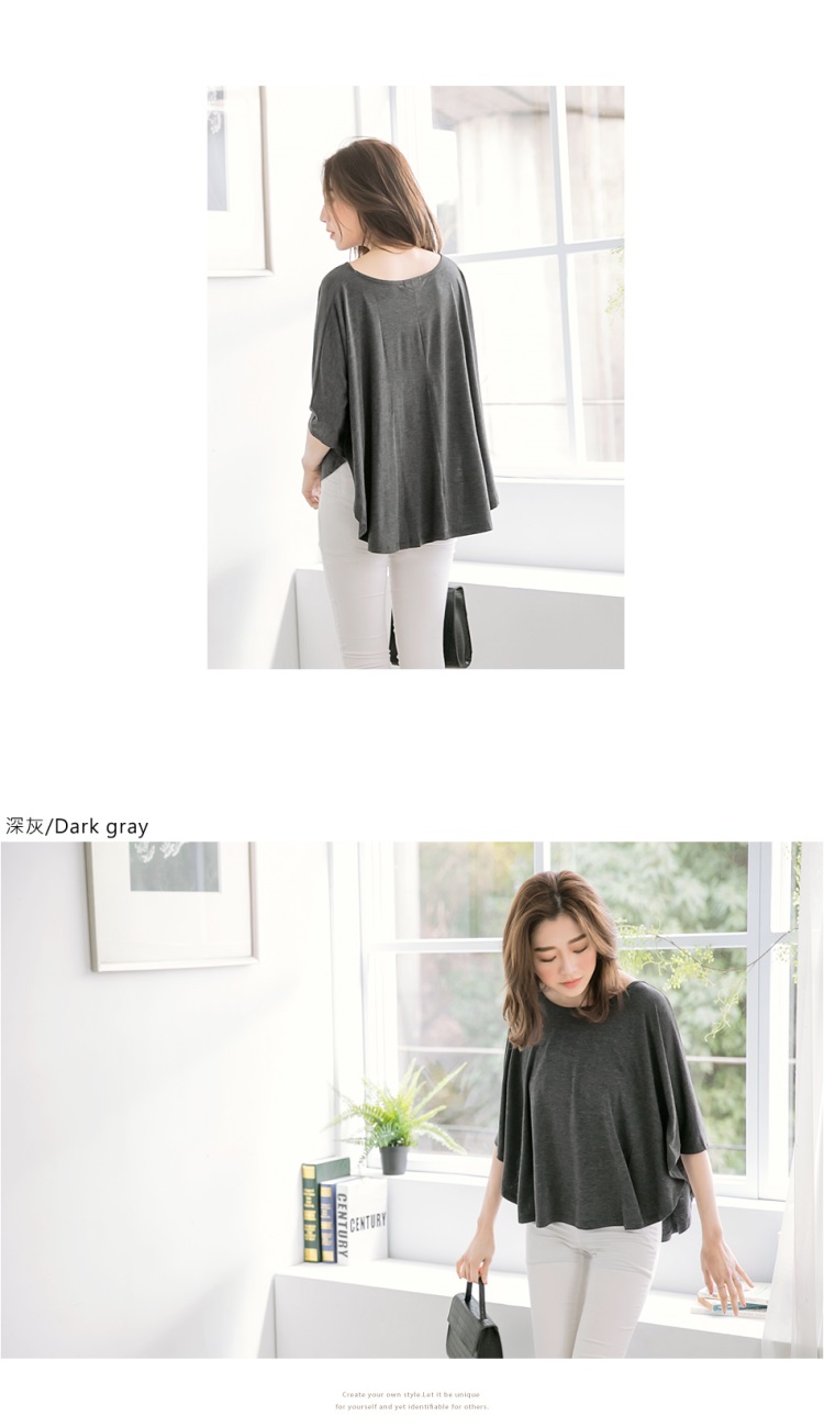 0605新品 素色飛鼠袖弧襬剪裁圓領寬鬆上衣.2色