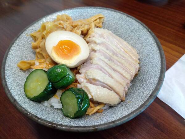 溏心蛋很入味,而且蛋黃還呈現濃稠膏狀雖然只有半顆溏心蛋,但使的蓋飯吃起來更加滑順,小黃瓜和筍~乾脆爽酸甜,可以挑戰你的味蕾為這碗無骨鴨肉腿蓋飯加分不少。