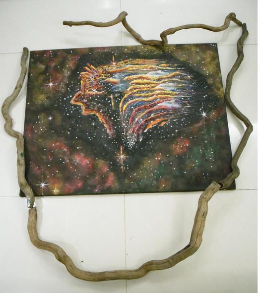 我每天在台北東區信義國中運動場跑步,其周邊樹林的形狀使人臆想到我國以西的原住民 -----美國印地安的瘋馬酋長臉孔和頭飾為此圖基本塑形,思及台灣南部的老鷹,及海邊的白海豚 ( 稀有動物的保護 ) 南投竹山杉林溪瀑布,加上以中國書法為筆法,畫出台灣各種文化交流所形成國際的競爭動力,來展現奇妙的組合,內容豐富的來描述包羅萬象的這太平洋上的一抹微笑。
