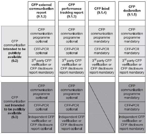 本技術規範發展過程中,主要的改變在於將量化與溝通兩標準整合為一,對於未來ISO/TS14067:2013使用者可以依據產品碳足跡量化方法之要求(如條文第6條及第7條)製作產品碳足跡研究報告。在溝通方面,ISO/TS14067:2013技術規範使用者可依據其用途選擇可公開或非公開之對外溝通報告、績效追蹤報告、碳標籤以及產品碳足跡揭露宣告。其中,碳標籤僅能選擇對外公開。相關要求請詳圖1。