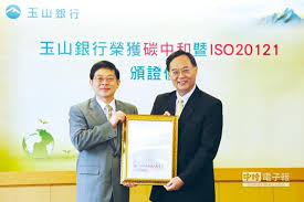 為實踐環境永續的企業願景,減緩氣候變遷影響,玉山銀行開金融業先例,正式導入「碳中和」(Carbon Neual)及「ISO 20121活動永續管理標準」,積極投入節能減碳,經國際認證機構SGS進行公正第三方(irdparty)查證,於4月30日獲頒國際雙料證書,為國內第1家「碳中和」銀行,且為國內第1家榮獲「ISO 20121國際認證」的銀行,創金融業雙冠紀錄。