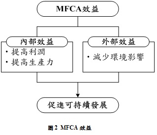 MFCA可提供企業內部和外部的利益,使企業擁有更大的利潤,且對環境影響較少,故其典型的內部收益就是加強組織的競爭力,以增加利潤和物質生產力。MFCA藉由企業投入較少原料而生產相同數量的成品,帶來有利的外部環境效益,進而減少對環境的影響,如:二氧化碳的排放量和自然資源的消耗。因為,以MFCA應用到產品製造過程,其可減少原物料投入量和二氧化碳排放量,從而促進企業持續發展。鑑於平衡環境影響和經濟因素是許多企業面臨的重要問題,並為實現可持續發展的希望,而MFCA連接了環境與經濟,提供極大的幫助,成為公認的寶貴管理工具(如圖2所示)。