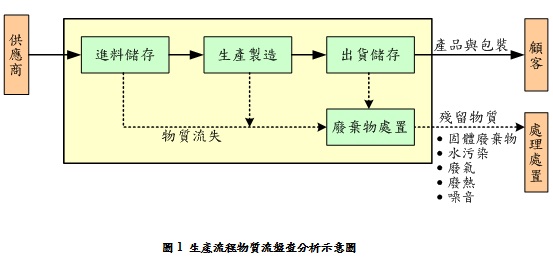 依據UN(2001)環境管理會計指導手冊之定義,物質流成本會計分析主要植基於產業物質流價值與成本(Values and costs of the material flows)之透明度,並可將相關之價值與成本區分為物質(Material)、系統(System)、以及傳遞與處置(Delivery and Disposal)等三大類。結合上述三類成本分析結果,彙整所得即為物質流成本會計分析。同時,依據UN(2001)環境管理會計指導手冊之建議,物質流成本會計分析流程可參考生命週期盤查分析(Life Cycle Inventory Analysis),分析流程圖示如圖1。亦即盤查物質投入與流失量(Material Losses),並結合各類投入產出盤查項目之成本資料,以進行類似生命週期成本(Life Cycle Costing)之評估分析。