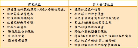 環境管理體系的建立和運作本身不必然會導致立即減少對環境的衝擊影響。本質上,環境管理系統是一種使組織實現及系統化地控制其已建立的環保績效水準的工具,其商業效益及第三者/方的效益如下: