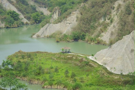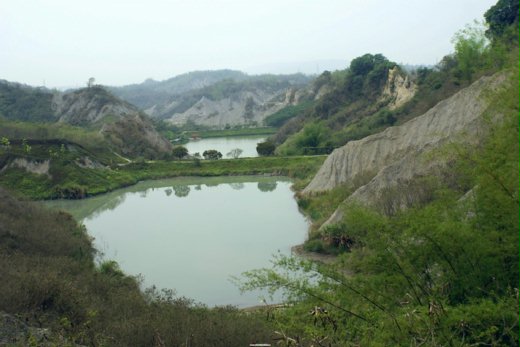 附近有很多的竹園 且在惡地包圍中有個池塘 在這個初夏時節 到處翠綠綠的 池塘