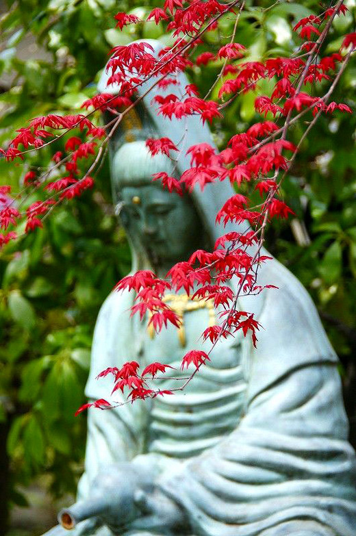 在紅葉後面的雕像 那股神情 另人覺得寧靜 彷彿時間都靜止在那一刻 忍不住