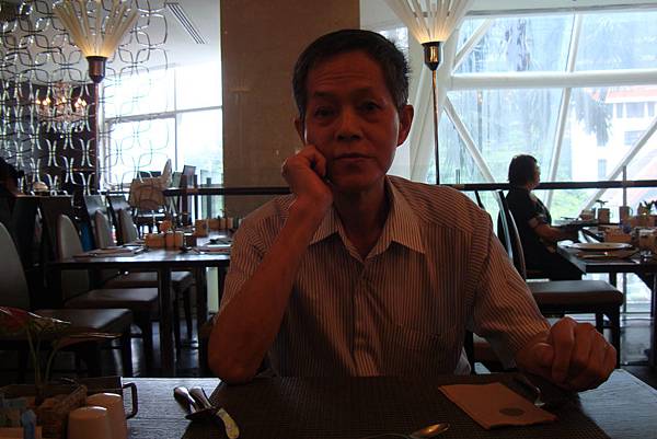 想拍餐廳內景有點逆光,但不敢使用閃光燈擾民,就先藉著拍W先生順道取景。