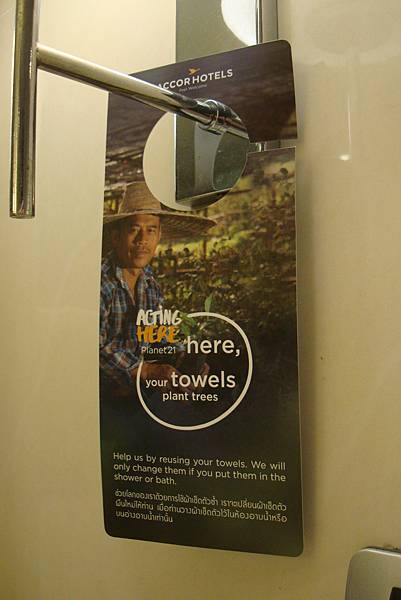 走進浴室,順便拍這張泰國每個飯店都有的環保呼籲廣告。