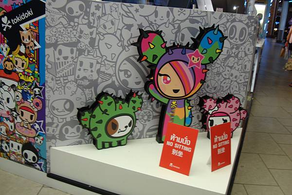 ▲前往電扶梯處,行經猴子品牌前,見到他們展示商品前方放著【別坐】的告示牌。