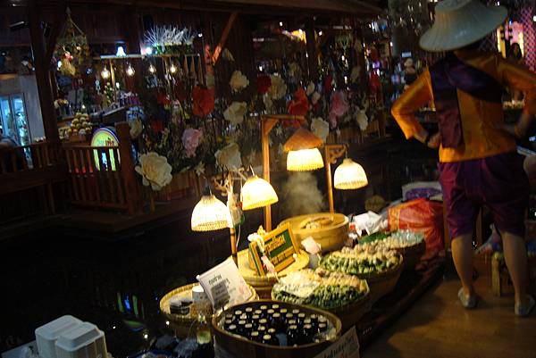 人工小河的兩岸停泊了一艘艘的小船,各有不同的吃食,船娘就在河岸邊做生意。