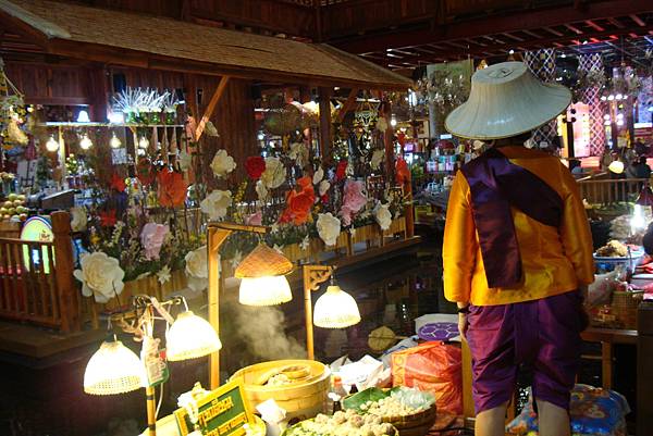 ▲站立一旁的營業人員,身穿泰絲質料的泰國傳統服裝,配戴著泰國的斗笠帽。