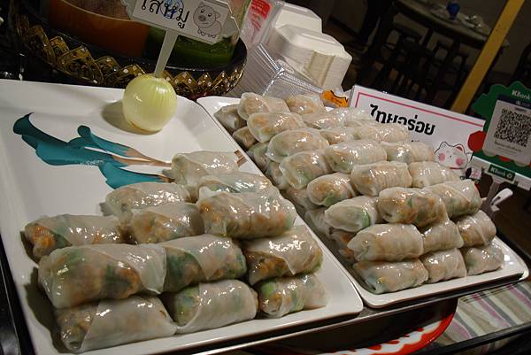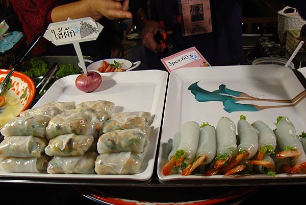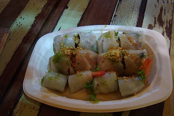 我們花了120銖買了6個河粉捲,一個人吃一排,老闆幫我們澆了醬汁,撒上花生粉。