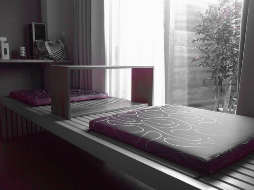 最喜歡的是房間中的臥榻,原木製材,簡潔有神,讓我們直拍照,嚷著回家也要依樣訂製!