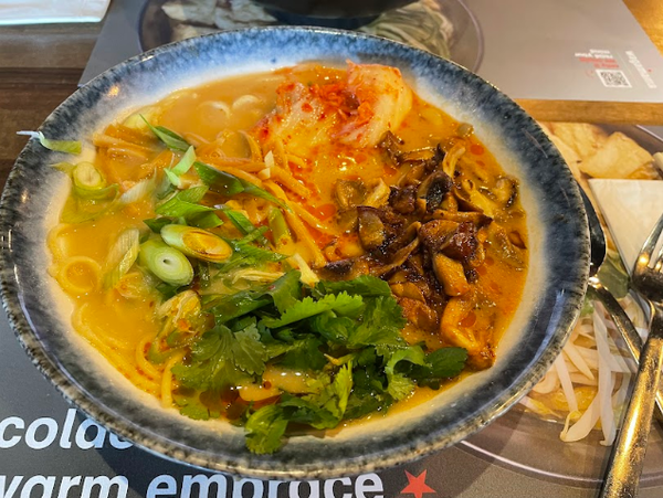 點了拉麵當晚餐, 有不少蔬菜的這碗拉麵,將近美金20元,不算便宜,但是湯頭味道不錯,對於我的東方胃是個不錯的選擇.飽餐後,我們搭乘M52路面電車在Vijzelgracht下車. 沒走多遠,就看到海尼根啤酒屋的總部了.