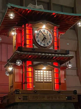 當時接近晚上七點, 道後溫泉站斜對角的少爺時鐘人物表演即將出場.
