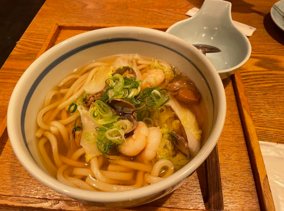 老伴和我不打算泡湯,因此只是到處走走逛逛.後來進入溫泉街的一家餐館點了碗烏龍麵當宵夜.