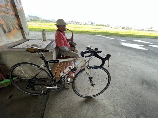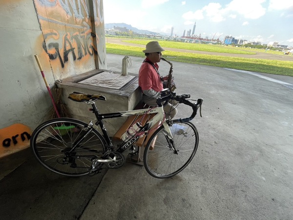 接著騎到國道一號(中山高)民權大橋底,他找個陰涼且可以聽劍吹喇叭手吹歌聲的地方休息。