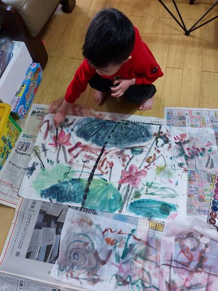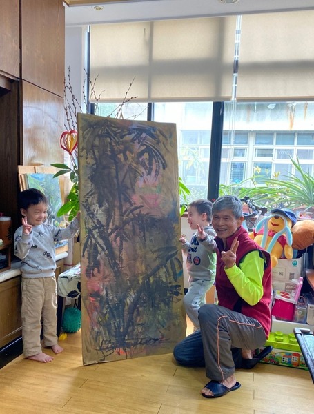 三年前阿哥和阿弟是4歲的小朋友,和奇阿公一起作畫,在兩塊電冰箱的包裝廢瓦楞紙上一起作畫。瞧他們作畫有模有樣,從拿筆塗鴨的畫作,以及和阿公站在一起完成的竹林大畫作前拍照。希望他們能繼續學習畫下去,並利用閒假繼續畫下去。將來長大以後,有興趣的話,阿公希望他們可朝這方向學習並發展。