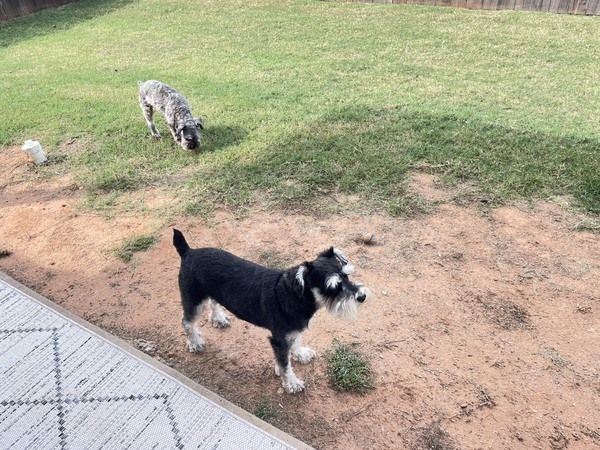 美國奧城 住在mustang 的二女兒家,養了兩隻雪納瑞狗(俗稱老公公狗,因為牠們有鬍子)冰棒和烏龜。冰棒(韓語是石頭拌飯的發音)是女婿在韓國時養的,三歲黑色。烏龜(turtle)是女兒在美國養的,五歲灰色,兩隻都是公狗。