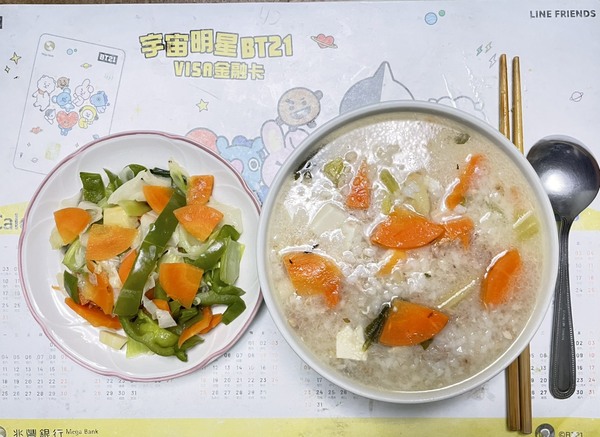 中午想吃碗虱目魚肉粥,就把虱目魚肉從冰箱取出先退冰。然後把想搭配一起吃的蔬菜,如紅蘿蔔、嫩薑、糙米飯、洋蔥一起煮成粥,再把虱目魚肉塊放入鍋內煮成虱目魚肉粥。