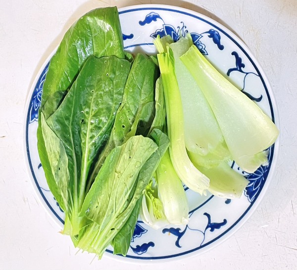 接著把青江菜用熱水燙一下,和紅蘿葡、高麗菜一起煮。