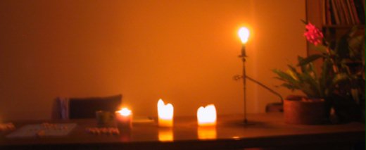 傍晚,家裡暗的像深夜,點起蠟燭,家變的非常的浪漫,算算總共點了13盞蠟燭。没事可做的兒子女兒,最後只好跟我下棋,從象棋、撲克牌一直下到跳棋;對跳棋沒興趣的兒子,只能在旁邊玩燭火,看他在玩蠟燭想起小時候用蠟做梅花,這一代的小孩不像我們小時候有那麼多的機會點蠟燭,因此從不知道用蠟燭也可以玩一些東西。