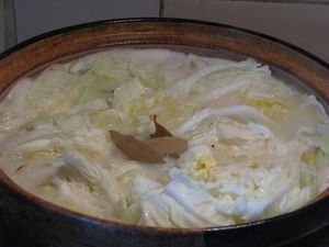 4 湯滾了之後,放入大白菜,加鹽、胡椒調味,再加入月桂葉,小火燉一小時即可