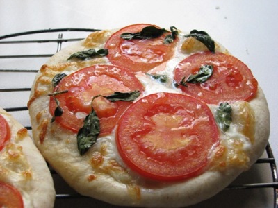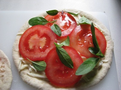 這個披薩先放莫佐瑞拉起士(mozzarella)、番茄片、九層塔,灑上一點鹽,淋上橄欖油即可